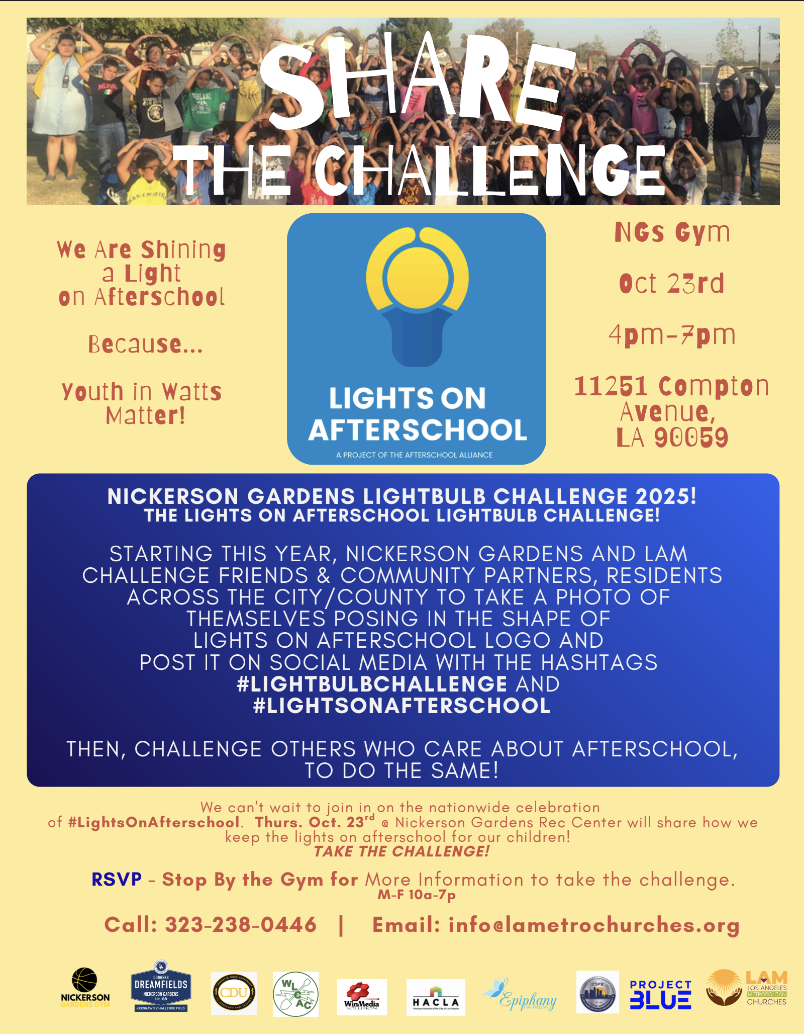 Share the challenge! Join the community in shining a light on the youth in Watts! October 23rd at 4:00pm-7:00pm at the Nickerson Gardens Gym. RSVP at the gym!