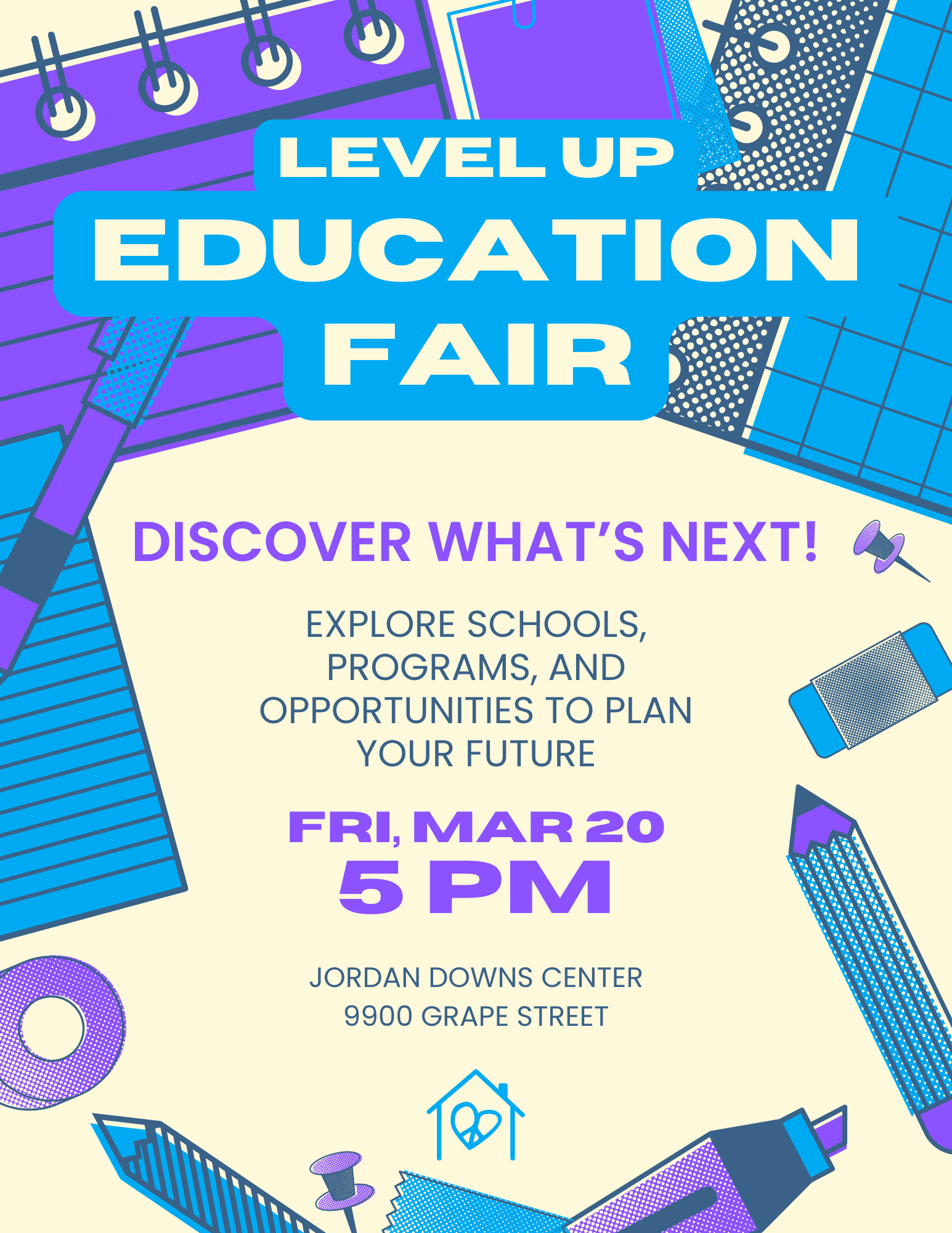 Level Up: Education Fair Friday, March 20, 2026 5:00 PM 6:00 PM Jordan Downs Center 9900 Grape Street Los Angeles, CA, 90002 United States (map) Google Calendar ICS