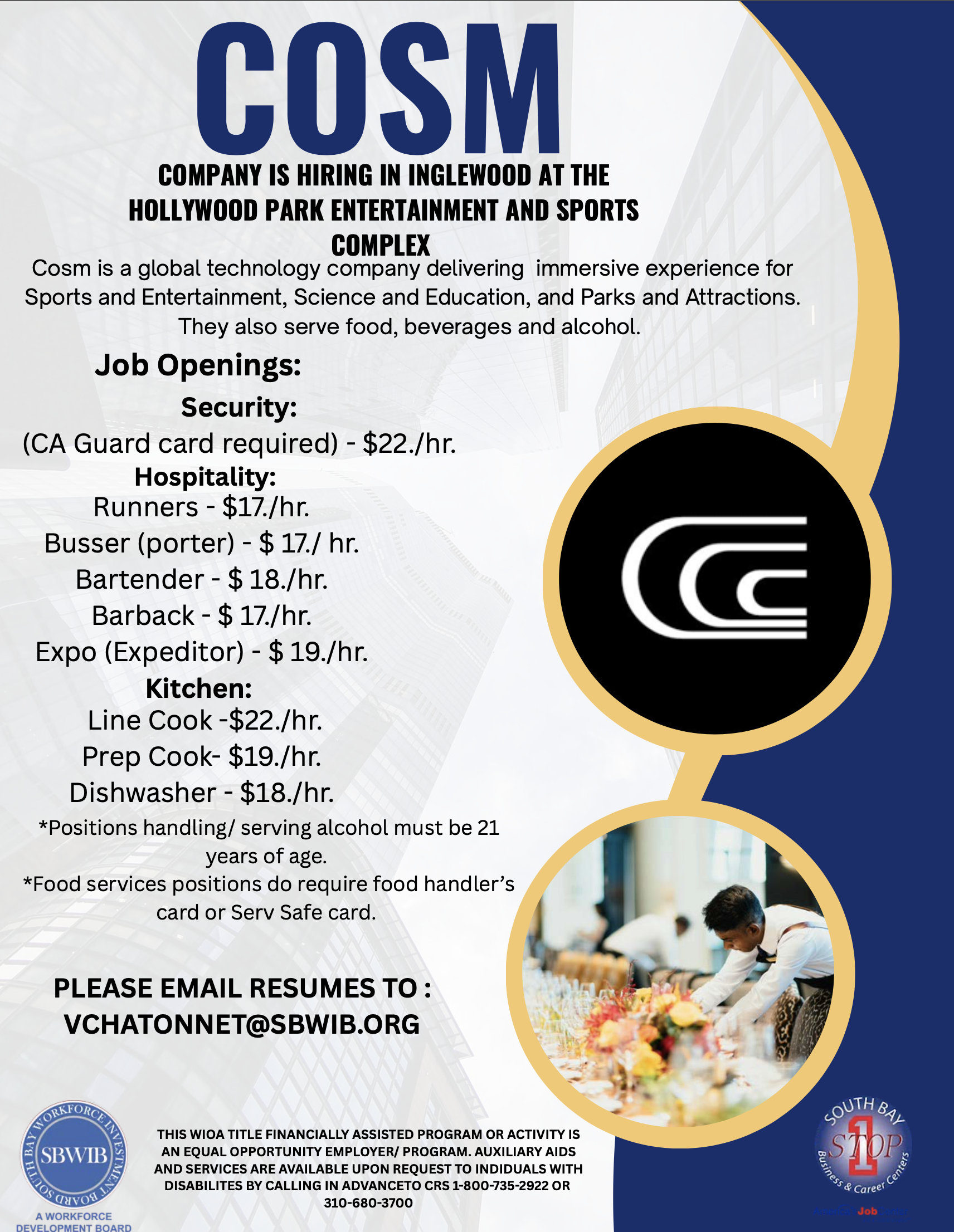 Hollywood Park Entertainment and Sports Complex is hiring multiple positions.