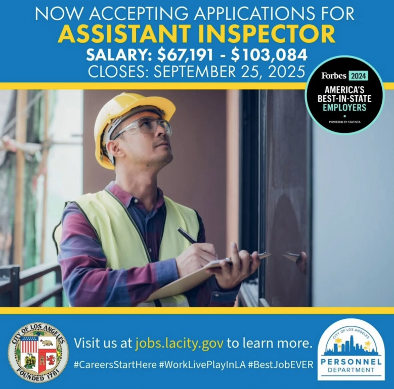 The City of Los Angeles is now accepting applications for assistant inspector. Closes September 25.